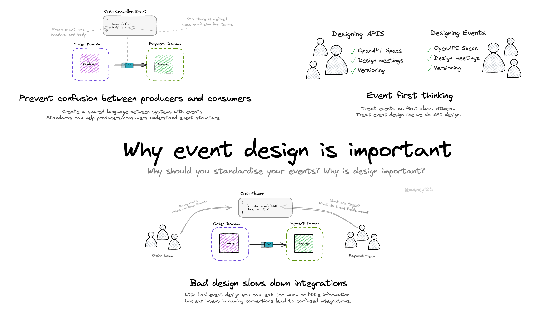 It becomes hard for architectures, developers and product folks to understand the architecture. Rework across your organization happens as no-one really knows what events you already have, or even how to consume them.