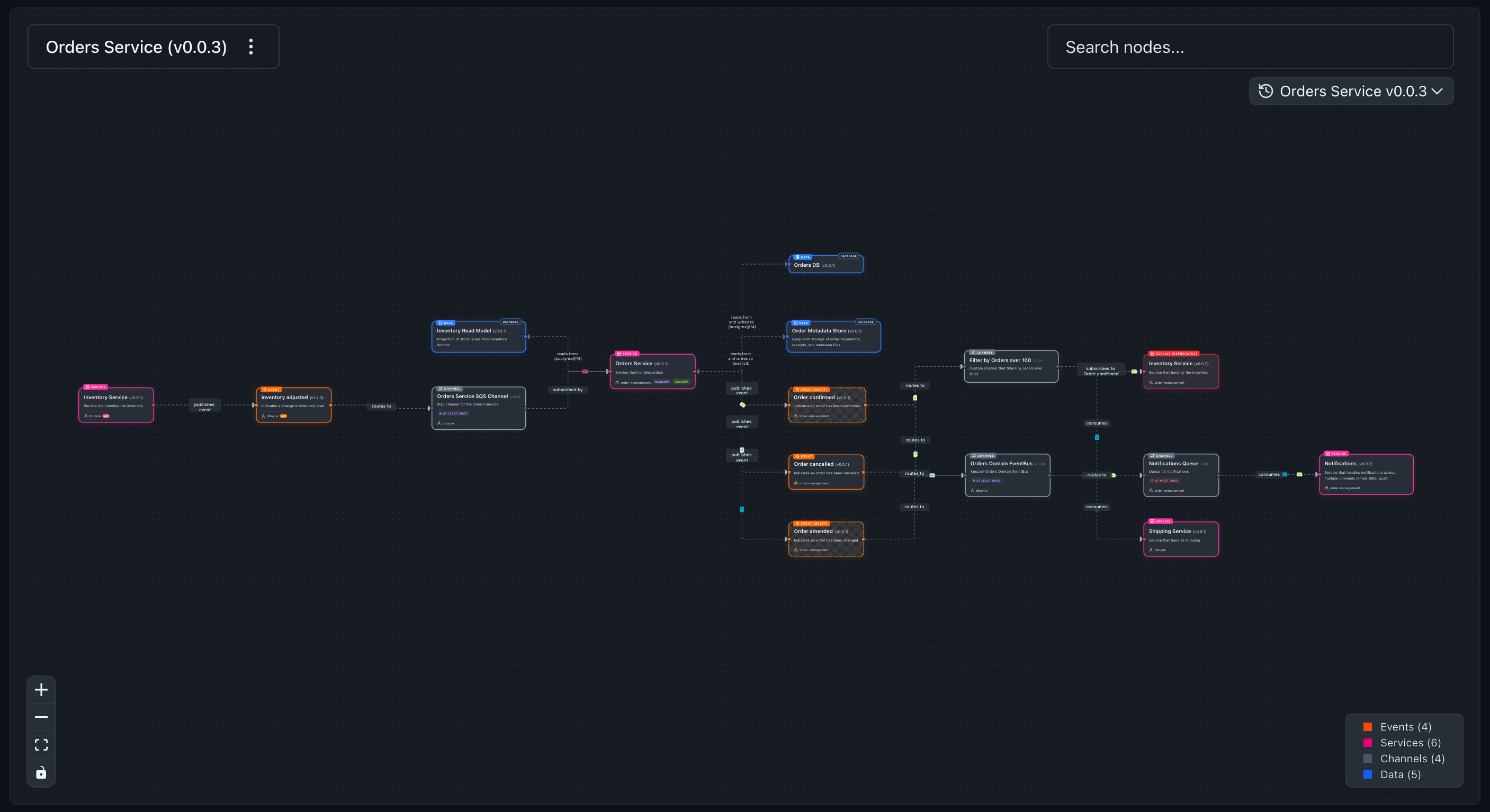 This is where I think the real value lives. You take those AsyncAPI files and you feed them into something that makes them browsable, searchable, and visual. Something that shows relationships between services. Something that tracks how schemas change over time. Something that tells you who owns what.