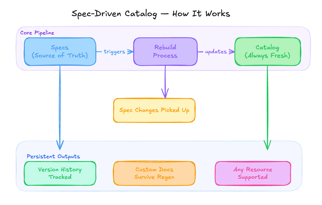 ]The specs stay the source of truth. Every time you rebuild, the catalog picks up changes. Version history is tracked. Custom documentation you add to any resource survives regeneration.